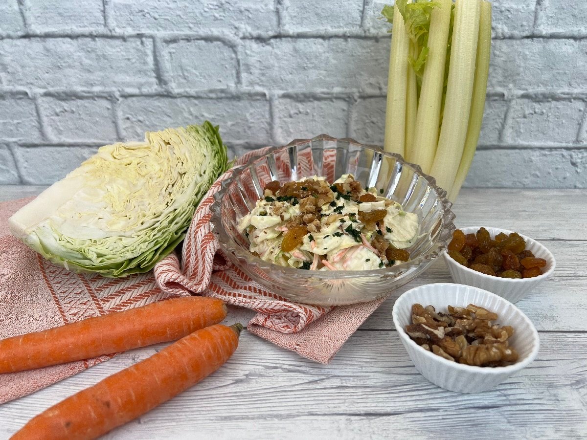 - Completate l’insalata con uvetta e noci tritate grossolanamente, quindi completate con un trito di erbe aromatiche fresche a piacere.