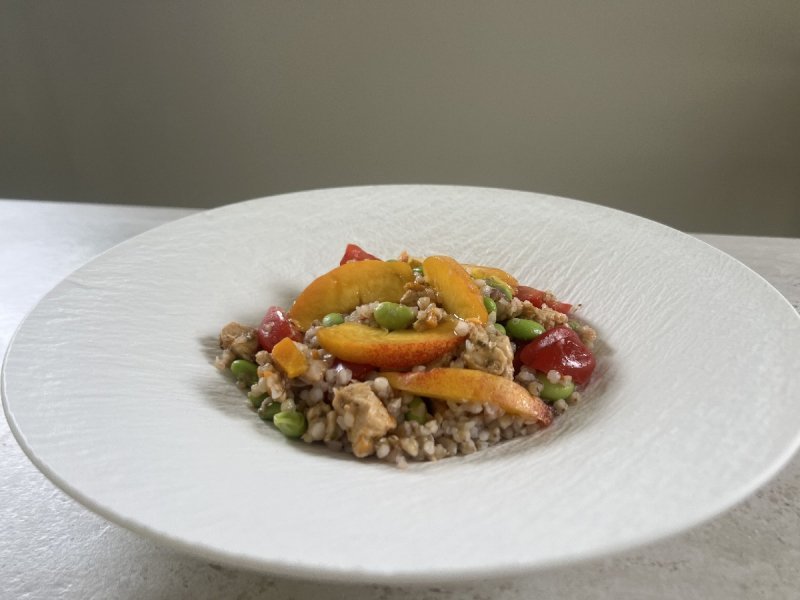 Version with gluten of Buckwheat Salad with Chicken Ragout and Grilled Peaches