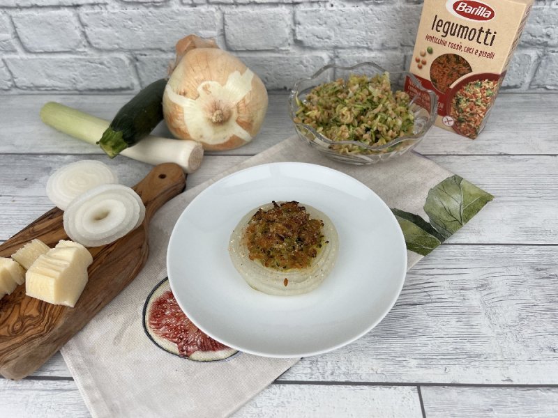 6. Stuff the emptied onions with the Legumotti, sprinkle with breadcrumbs and a drizzle of oil and put in a convection oven preheated to 200°C for 15 minutes to gratin.