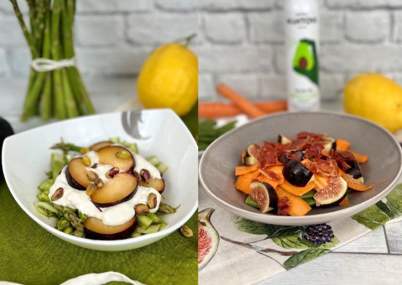 Asparagus continues to be present, which we can enjoy with a mouth-watering cheese cream and plums for a salad that also becomes a green all-in-one dish, great to take to the office or to the pool in a convenient lunch box.