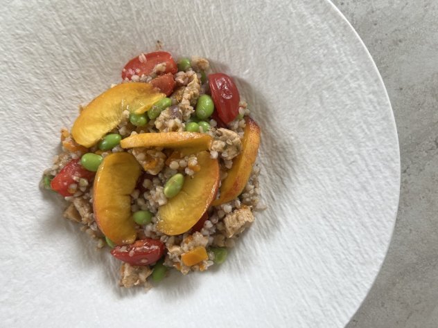 5. Halve the cherry tomatoes and add them to the drained buckwheat, then add the edamame and finally the chicken ragout, mixing everything well. Serve with a few slices of nectarine or peach.