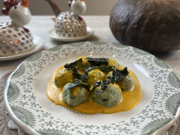 6. Bring a pot of water to a boil, salt it, then gently add the ricotta bites. Cook them until they rise to the surface. Remove them with a slotted spoon, place them on the pumpkin fondue and top with a little more fondue. Finish with the black kale leaves you set aside for decoration.