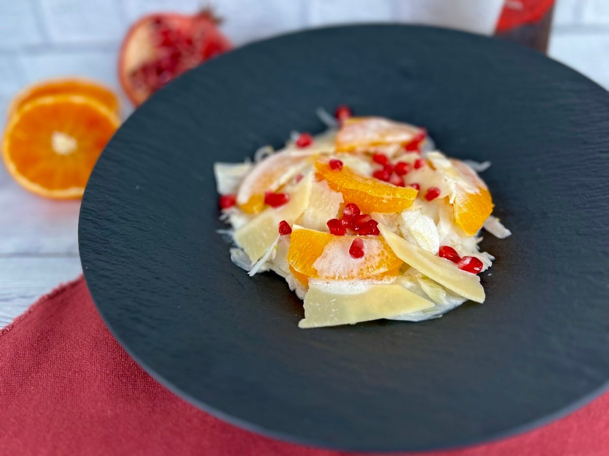 - Componete l’insalata: mettete il finocchio, gli spicchi d’arancia, le lamelle di formaggio, quindi condite con la salsina leggera all’arancia e completate con chicchi di melagrana.